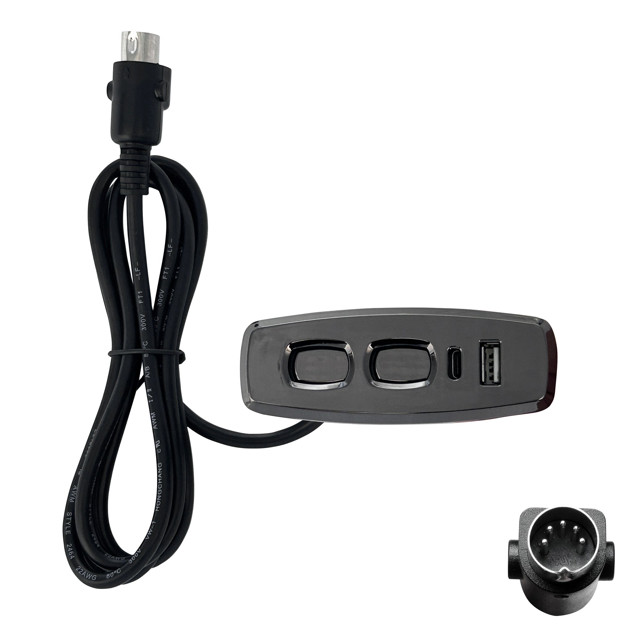 This is 4 button 5 pin switch model DL-SK-069 replacement with usb type a c port, you could charge your phone and pad at the same time. The distance between the holes is 3.4 inches, you can use on many different brands of recliners and lift chairs that use the 5 pin round plug. It has 2 buttons and designed to operate a two actuators, one being the footrest and the second the headrest.