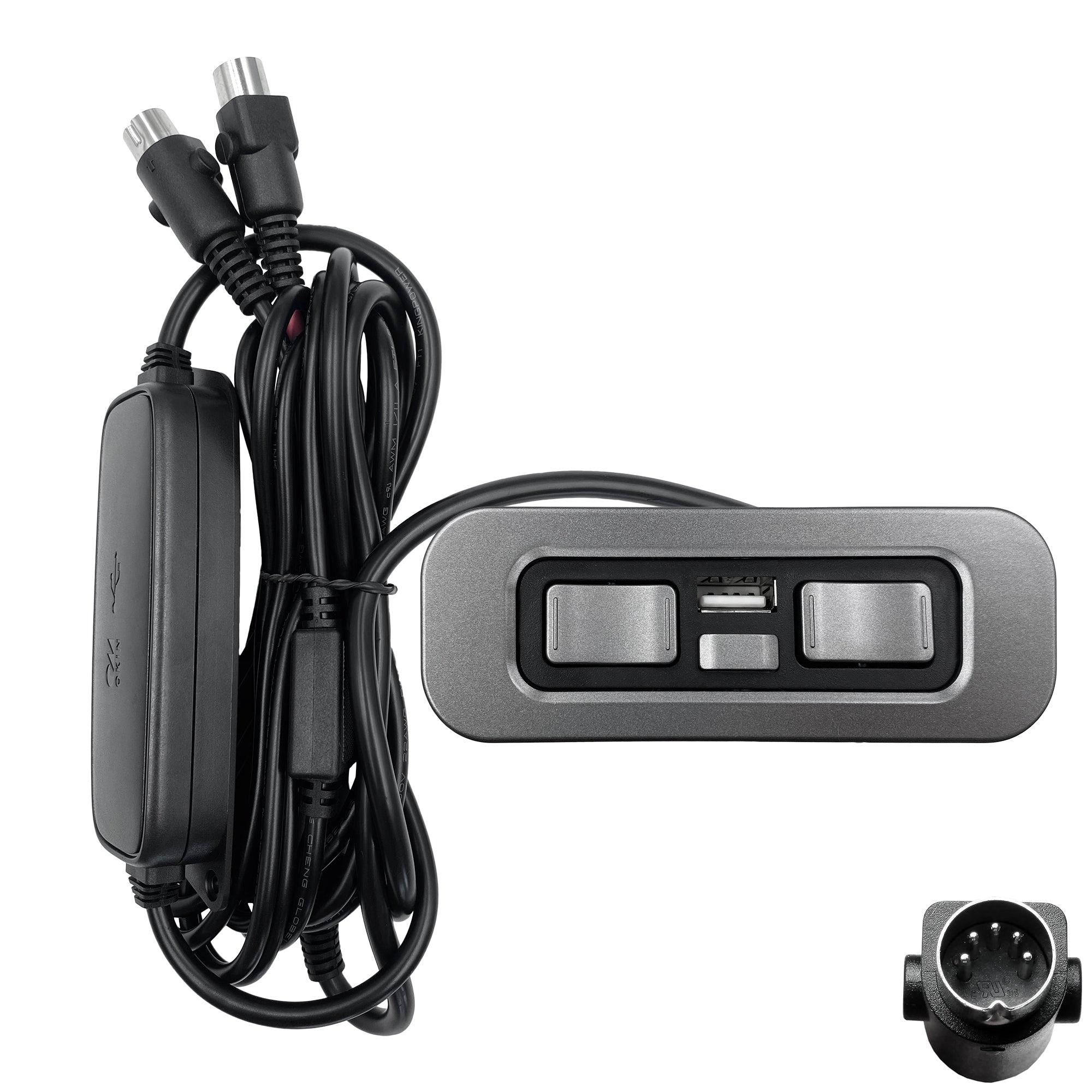 This is 5 button switch controller control model JLDK.15.08.27 with USB, you can charge your phone. It has dual 5 pin male plugs, suitable for power recliners or lift chairs with two motors, with 4 butterfly-shaped buttons that control the backward and forward of the head cushion, as well as the open and close (raise and recline) of the chair. The switch can replace the JLDK.15.08.27 and JLDK.15.08.04 switch, please only order it when the switch has the exact same model number. The home button as a reset button, press the button for a long time to reset.