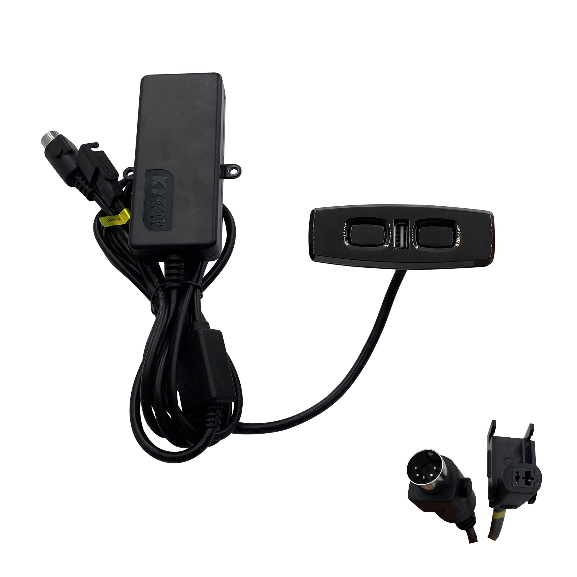 This is kaidi 4 button switch model KDH120-003 replacement with usb. The switch has 5 pin male connector and 2 pin female connector.