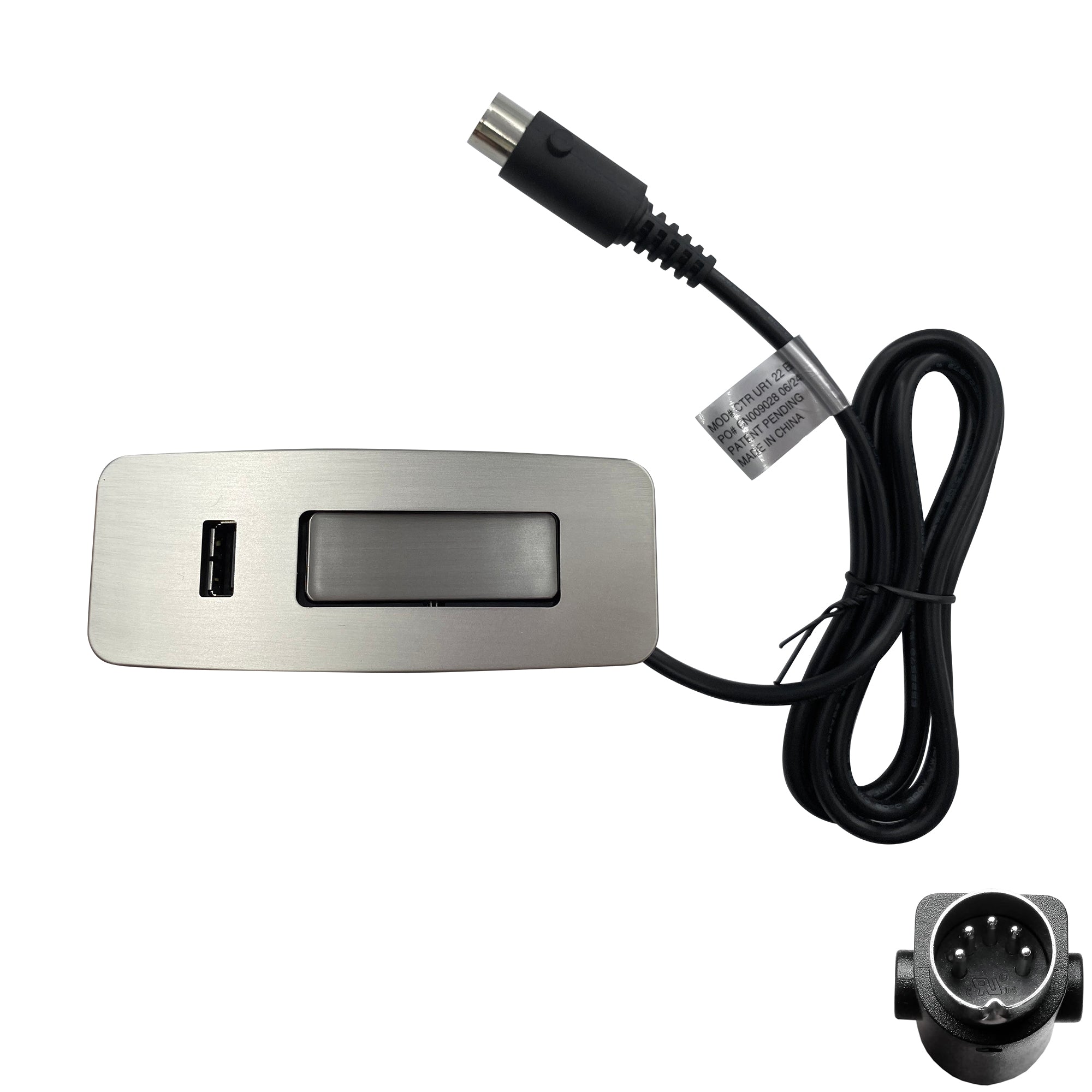 This is raffel systems 2 button 5 pin switch model CTR UR1 22 BA replacement. The control has a brushed aluminum finish and features a usb port, you can charge your phone. It has 5 pin at the end, if it is different, it can not be replaced.