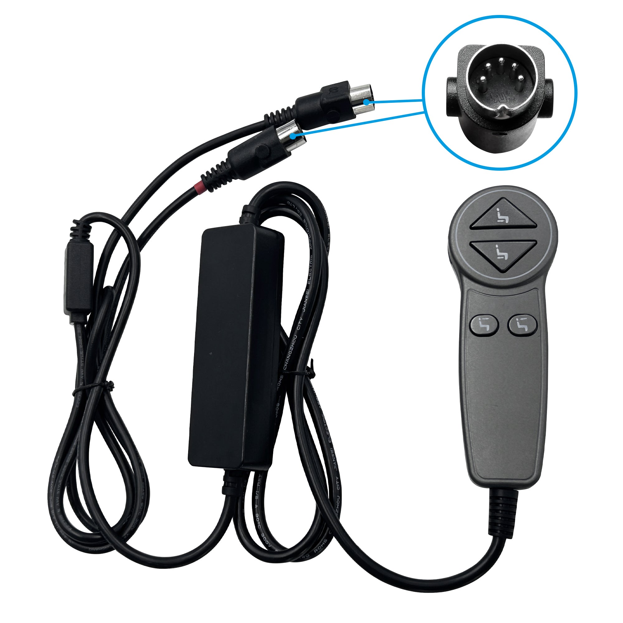 This is mulin 4 button 5 pin power recliner lift chair remote model mlsk57-J1 replacement. This remote has two 5 pin male plug, controls two motors,